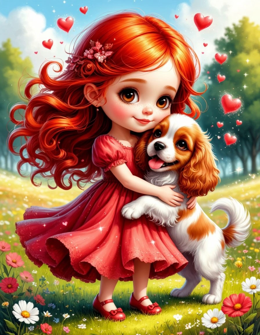 Девочка со щенком. Промпт: Причудливая иллюстрация милой девочки-чиби в струящемся малиновом воздушном платье, с ярко-рыжими длинными кудрявыми волосами и крошечными туфельками, в фантастическом стиле Бориса Вальехо. Она нежно обнимает игривого спаниеля, окружённого аурой радости, любви и тепла, запечатлевая трогательный момент дружбы и привязанности. Нежные мерцающие блёстки и маленькие парящие сердечки окружают эту пару, усиливая ощущение волшебства и чуда. На заднем плане — мягкий солнечный луг с разбросанными полевыми цветами, создающими причудливую и идиллическую атмосферу. Нейросеть: Шедеврум Студия. #цифроваяживопись #нейросеть #девушка #нейроарт #идеи #цифровоефото #рисунок #арт #нейрофото #артыотнейросетей #aiwoman #DigitalDreamscapes #digitalart #шедеврум #aiartwork #иллюстрация #шедеврумстудия #рыжая #девочка #нейроSD #собака #чиби #ai