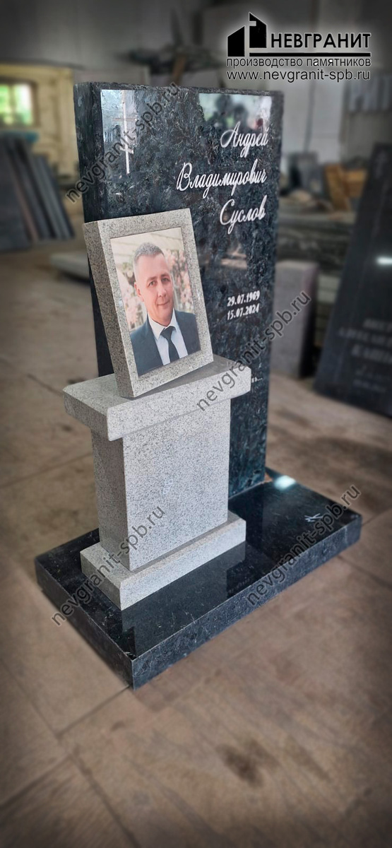 Этот памятник отличается своей современной и оригинальной композицией, сочетающей в себе строгость линий и теплоту воспоминаний. Он состоит из трех основных элементов, каждый из которых выполнен из высококачественного гранита. Первый элемент – это вертикальная стела из голубого гранита с вкраплениями. На ней выгравированы имя, отчество, фамилия и даты жизни усопшего, а также небольшой православный крест в верхней части. Стела служит фоном и символизирует вечность памяти. Второй элемент – это светлый гранитный постамент, имеющий форму колонны. На верхней площадке постамента установлена фоторамка, также выполненная из светлого гранита. В рамке размещена фотография усопшего, создающая личный и теплый образ. Третий элемент – это основание памятника из голубого гранита. Оно служит опорой для всей конструкции и придает ей устойчивость и завершенность. Сочетание темного и светлого гранита, а также минималистичный дизайн делают этот памятник современным и элегантным. Он не перегружен деталям