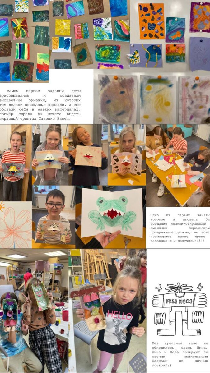 Как прошёл творческий год китят в мастерской с художницей Полиной Марковой🎨 Объединить разноцветные бумажки, яичные лотки, фетр, втулки, фольгу, старые картонные коробки и детскую фантазию смогла наша мастерская, в которой пылом с Полиной дети становились художниками, изобретателями и авторами своего собственного мира🥰 Мастерская стала для детей пространством свободы, юмора, глубины и откровенного восторга от процесса👇🏻 С самых первых занятий начали с простого: разрисовали себя и листы бумаги, чтобы сделать из них первый коллаж. А потом шаг за шагом начали выдумывать свои книги, маски, дома, пейзажи, пиццы и даже телевизоры!>>>
