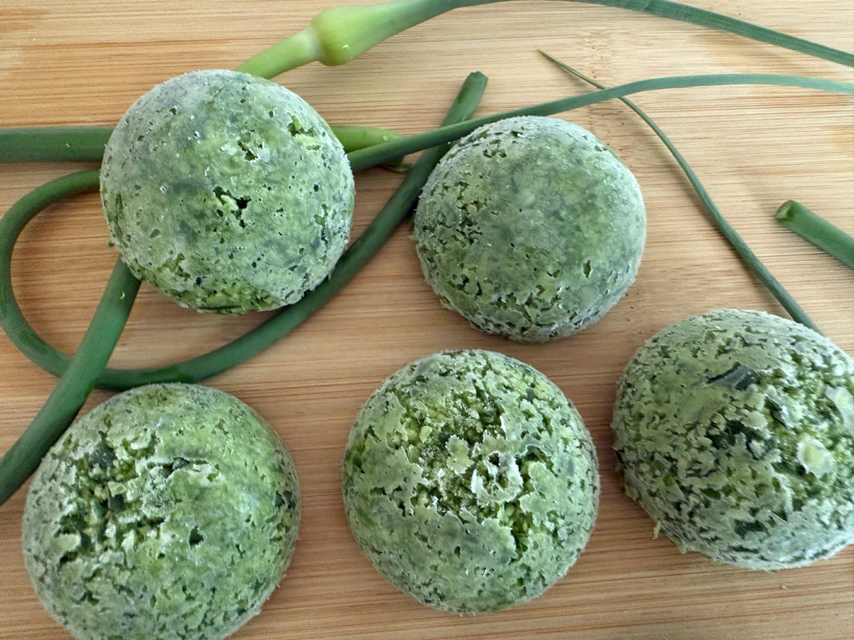Добро пожаловать на мою кулинарную страничку! Друзья, наверное, вы все знаете как полезны чесночные стрелки. В них содержатся фитонциды и аллицин, обладающие противомикробным действием, а также калий, натрий, фосфор, магний, селен, кальций, необходимые для работы сердечно-сосудистой, костной и нервной системы. Чесночные стрелки богаты витамином С, витаминами E, PP, группы В. В пищу они употребляются как в сыром виде, так и в качестве ингредиентов для различных блюд. Из них можно готовить супы, гарниры, салаты, различные соусы. Но, к сожалению, мои дети отказывались употреблять их в пищу. Но я знаю, как чесночные стрелки отлично поднимают иммунитет! И я нашла способ как можно сохранить их и добавлять в пищу осенью и зимой - в сезон простуд и вирусов! Приготовление блюда: 1. Чесночные стрелки промыть под проточной водой, нарезать и сложить в чашу блендера. 2. Перемолоть все блендером. 3. Разложить приготовленную массу по силиконовым формочкам (у меня полусферы) и убрать в морозилку мин
