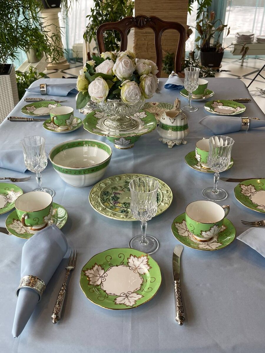 На столе сегодня господствует цвет свежей молодой травки, которую уже так хочется увидеть ранней весной. Две фаянсовые тарелочки, изготовлены не просто на разных фабриках семьи Кузнецовых. Они из разных ветвей этой большой семьи. Первая тарелка изготовлена на фабрике Матвея Сидоровича Кузнецова. А вторая изготовлена на фабрике Ивана Емельяновича Кузнецова. Обе тарелки выполнены из фаянса. Они легкие и очень теплые. Одна украшена декоративным рельефным рисунком. А на второй перед нами жанровая сценка, иллюстрирующая басню Крылова «Лиса и виноград». Может фигура лисицы и не отличается высокохудожественным исполнением, но сюжет узнаваем и прекрасно «читается». А уж про красоту зеленого цвета можно и совсем ничего не говорить. Оттенок поистине весенний. (Хотя зрелость винограда скорее указывает на осень) Очень хочется настоящей весны! Без снегопада и серого неба. Хочется яркого солнца и тепла!