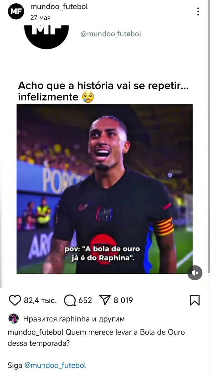 Долгое время «Золотой мяч», самая престижная индивидуальная футбольная награда, вручалась только игрокам из Европы. Только в 1995-м ею стали награждать футболистов вне зависимости от национальности. Сразу же после принятия этого решения трофей получил Джордж Веа из Либерии. За тридцать лет «Золотой мяч» получали только четыре бразильца: Роналдо, Ривалдо, Роналдиньо и Кака. Причем последний − аж в 2007 году. С тех пор представители этой нации постоянно были где-то рядом, но ни разу не награждались. Последним реальным претендентом был Винисиус Жуниор. Вингер «Мадрида» считал себя победителем, но «Золотой мяч» забрал Родри из «Манчестер Сити». Кажется, что эта тема очень волнует бразильцев. Издание O Mundo do Futebol в социальных сетях разместило видео, с нарезкой моментов из игры Винисиуса Жуниора, Неймара и Рафиньи Диаса. Надпись гласит: «Думаем, история, к сожалению, повторится». Имея в виду, что и в этом году индивидуальная награда достанется вновь не бразильцу. Этому ролику лайк пост