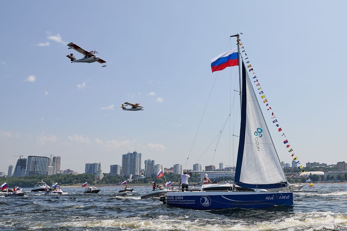 Масштабный праздник состоялся в самарской акватории 12 июня. Фестиваль «Парад на Волге» объединил водомоторную технику, парусные суда и даже малую авиацию: