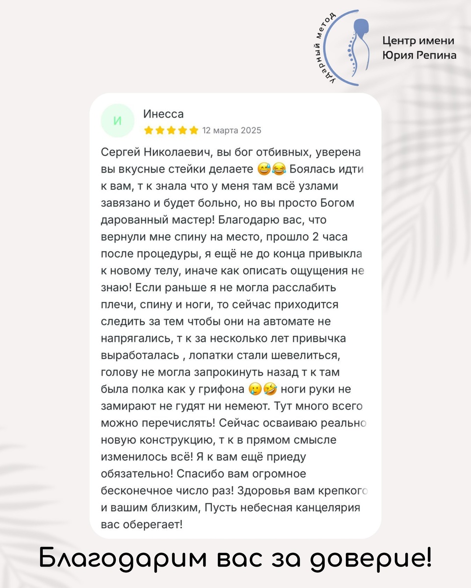 ✨ Только что вы познакомились с Поздеевым Сергеем Николаевичем — специалистом центра имени Юрия Репина, которому ежедневно доверяют своё здоровье десятки пациентов. А теперь — слово тех, кто уже прошёл через приём. 📣 Это отзывы от людей, которые пришли с болью и ушли с облегчением. Их впечатления — самый честный показатель результата. Читайте — возможно, среди них вы узнаете себя. #отзывы@yurirepin