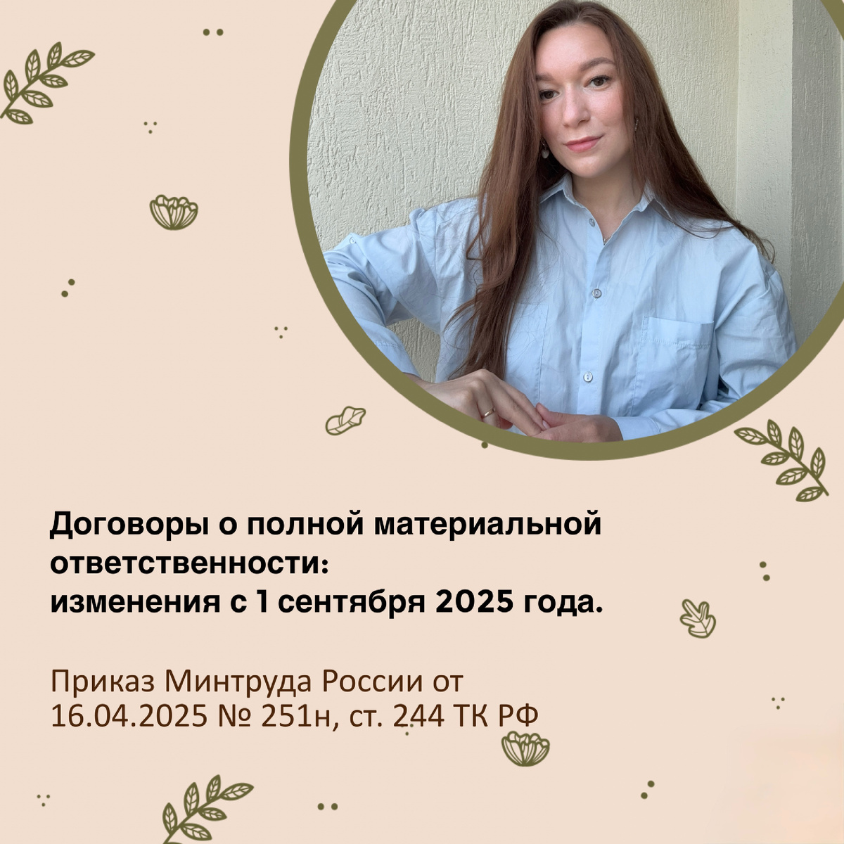 Продолжаю серию постов об изменениях в трудовом законодательстве. Минтруд России выпустил Приказ № 251н от 16.04.2025, утверждающий новые типовые формы договоров о полной материальной ответственности, которые вступят в силу с 1 сентября 2025 года. Цель обновления — адаптация к современным реалиям, включая кадровый электронный документооборот (КЭДО). В связи с этим, компаниям необходимо: с 1 сентября 2025 года необходимо будет заключать договоры о полной материальной ответственности по новым формам, утвержденным Минтрудом. Важно помнить: - Договоры о полной материальной ответственности можно заключать только с работниками, достигшими 18-летнего возраста, которые непосредственно обслуживают или используют денежные, товарные ценности или иное имущество. - Несоблюдение установленной формы договора может повлечь за собой признание его недействительным в судебном порядке. Рекомендации: 1. Проведите проверку действующих договоров о полной материальной ответственности на предмет соответс