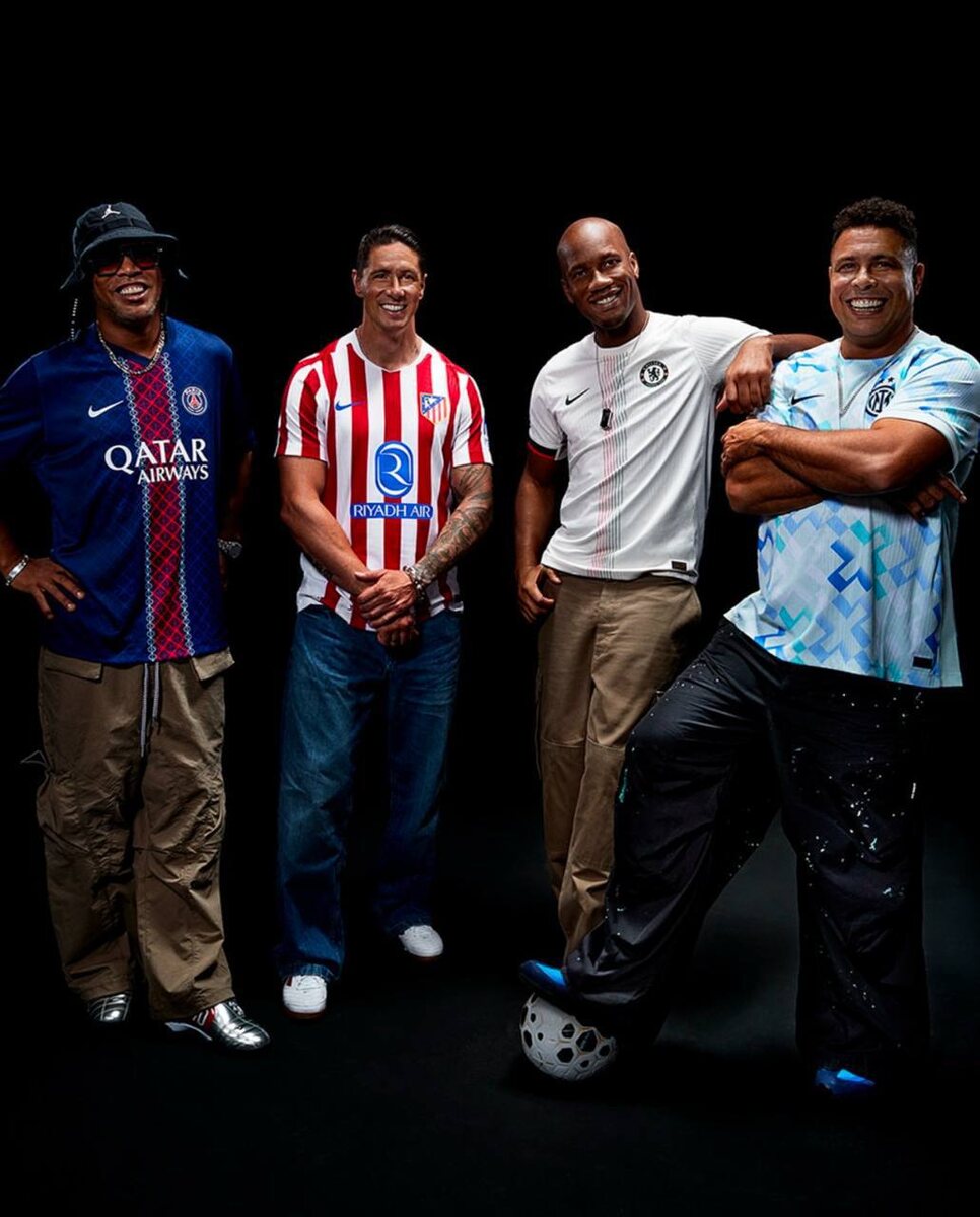 «Атлетико», «Челси», «ПСЖ» и «Интера». Nike устроил одно из самых красивых представлений комплектов формы на новый сезон сразу для нескольких клубов. По крайней мере, легендарность футболистов зашкаливает. Потому что форму «Атлетико» представил Фернандо Торрес, «Челси» – Дидье Дрогба, Роналду позировал в джерси «Интера», а Роналдиньо – в футболке «ПСЖ» и панамке Air Jordan. Легенды на фото только в футболках – образы дополнили повседневной одеждой и аксессуарами. Все в стиле блоккор. У каждой звезды есть и отдельные фотосессии. Вот Фернандо Торрес в новой домашней форме «Атлетико». Хорошее напоминание о том, что «Эль-Ниньо» – главный воспитанник мадридцев в XXI веке: стал иконой и капитаном уже в 22 года, уехал в Англию, выиграл все главные титулы и вернулся в родной клуб завершать карьеру. Дидье Дрогба представил новую гостевую форму «Челси», в ней команда сыграет уже с «Фламенго» и «Эсперансом» на клубном ЧМ. Ивуариец – главная легенда атаки в современной истории «Челси», лучший бомб