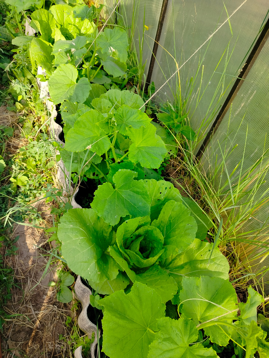 Здравствуйте, уважаемые гости "Ранчо "Джек и компания". Я люблю экспериментировать на своем участке. Это дает мне опыт. Я пробую различные лайфхаки, которые помогают другим людям вырастить хороший урожай. Мне чаще всего это не помогает. Но я верю, что когда-нибудь я тоже смогу на своем огороде получать отличные урожаи. Может, это даже случится в этом году. Очень хотелось бы. В этом году я впервые попробовала посадить между огурцами пекинскую капусту. Огурцы у меня в этом году растут в теплице (обычно я их сажаю в огуречник и бочки). Пока я вижу только плюсы от такого способа. Можно на меньшей площади посадить больше растений. Капуста растет внизу и не мешает огурцам, которые лезут вверх. Большие листья капусты закрыли почву, предохраняя ее от пересыхания. Вот что я сделала зря, так это я совершенно напрасно посадила на грядку с капустой и огурцами еще и шпинат. Огурцы и капуста заняли грядку полностью и не оставили шпинату места для роста. Он, конечно, сделал попытку взойти, но быстро
