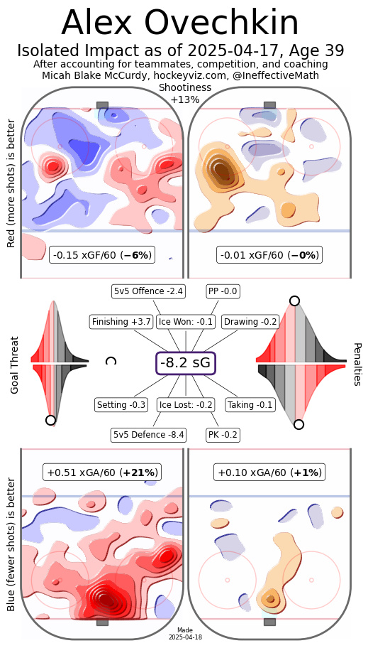 О визуализации: Этот график от Майки Блэйка МакКерди (hockeyviz.com) показывает, как игрок влияет на игру, находясь на льду. Сверху – атака команды (в равных составах и в большинстве), снизу – оборона (в равных составах и в меньшинстве). Красно-оранжевые зоны – команда чаще бросает оттуда; сине-фиолетовые – реже. Полезный игрок – это больше красного у чужих ворот и синего у своих. В центре – показатели игрока по сравнению со средним по лиге: завершение атак, создание моментов, штрафы. Цифра в центре – «синтетические голы» – общее влияние игрока на результат.