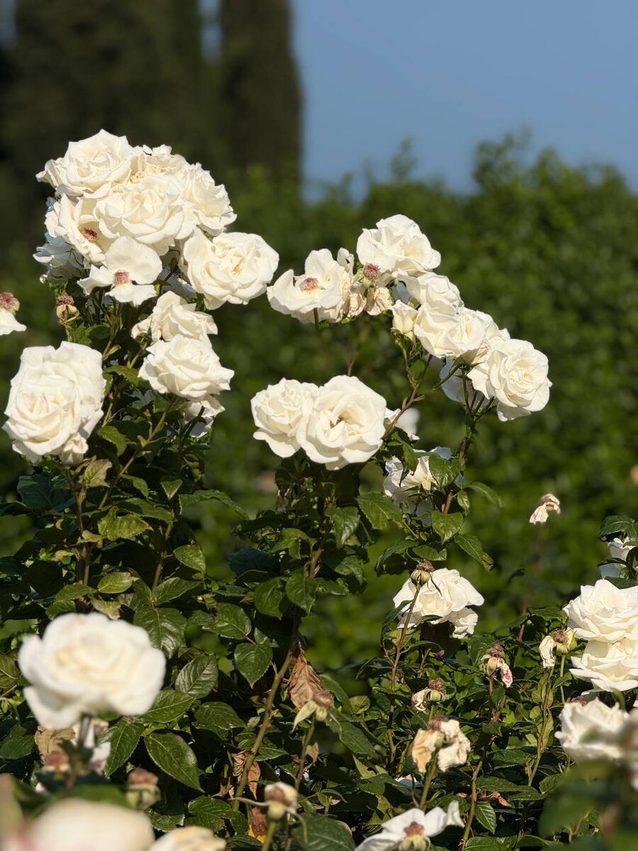 Вспоминаю приключение, которое произошло со мной в 2011-м, когда прохожу мимо этой цветущей белой розы «Ливадия» Я пришла устраиваться в музей в день рождения Николая II и год 100-летия Ливадийского дворца. Отмечали его в сентябре, и по этому поводу приехал французский садовник, подаривший музею сорт розы «Ливадия», специально созданный к юбилею. Филипп Манга подарил чайно-гибридный сорт, созданный французскими селекционерами Meilland в 2010 году. Диаметр цветка составляет от 10 до 12 см. Одним из главных преимуществ розы является её обильное повторное цветение до первых заморозков. А в нежном аромате цветков, как пишут на канале Ливадийского дворца-музея «присутствуют ноты банана, персика, белой лилии и ландыша». Помню, как нам с коллегой Ириной поручили держать плакат с фотографией розы во время выступления Манги. Мы все надеялись, что он забудет про плакат, потому что жутко боялись выходить с этим плакатом на сцену 😂 Но он смотрел на нас и ждал 😂 Пришлось выйти)) Где-то в не