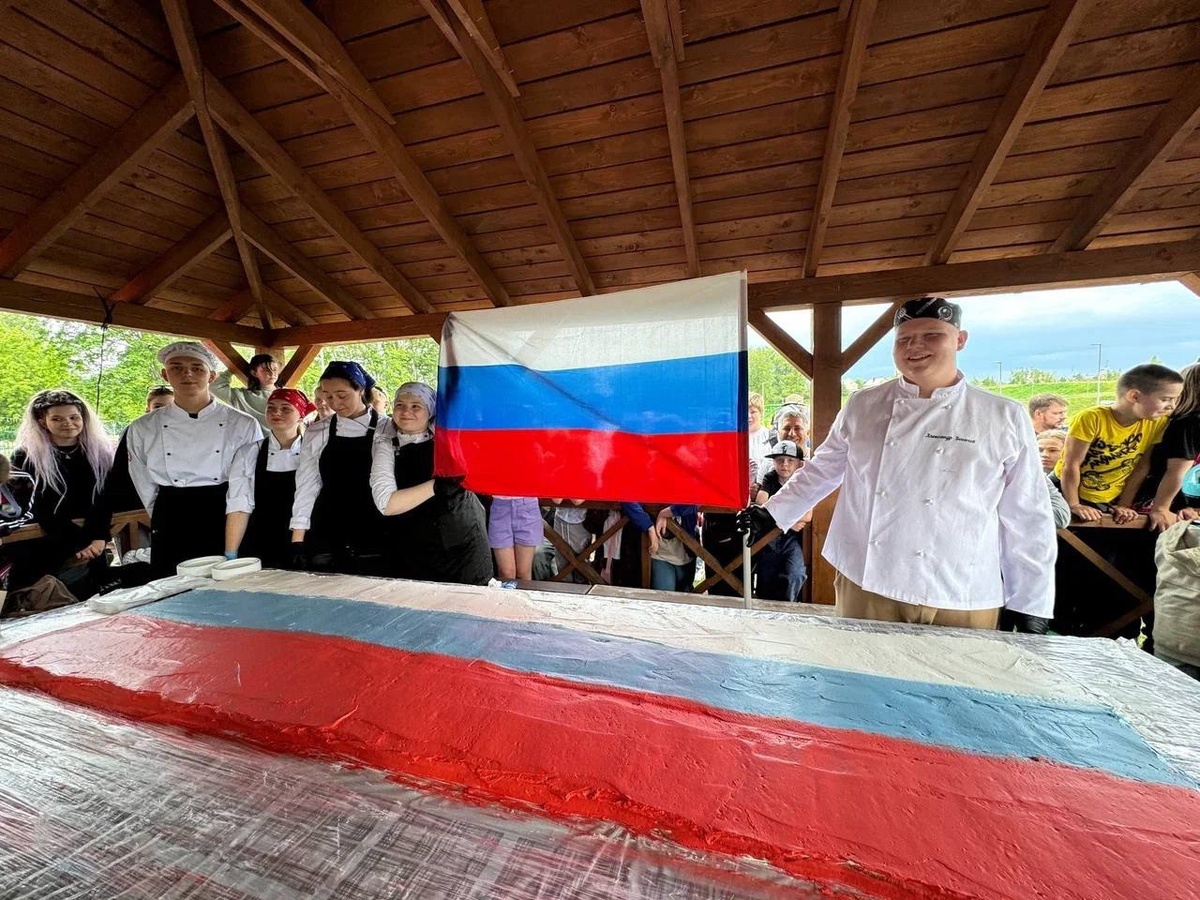 В Можайске испекли гигантский торт в цветах российского флага Студент Можайского техникума и участник федеральных кулинарных шоу Александр Богачёв провёл для жителей округа мастер-класс по созданию масштабного десерта. Вместе с однокурсниками он приготовил торт-триколор длиной три метра и весом более 100 кг. «Идея возникла спонтанно — просто шёл с работы и подумал: „А почему бы не сделать большой торт?“ Друзья поддержали, и вот результат — всё получилось даже лучше, чем я ожидал!» — поделился Александр. Гости с интересом наблюдали, как кондитеры покрывали десерт ванильным кремом, а затем смогли его продегустировать. Часть угощения передали благотворительным организациям. Мероприятие не только подарило зрителям яркие впечатления, но и стало примером кулинарного мастерства и патриотизма.