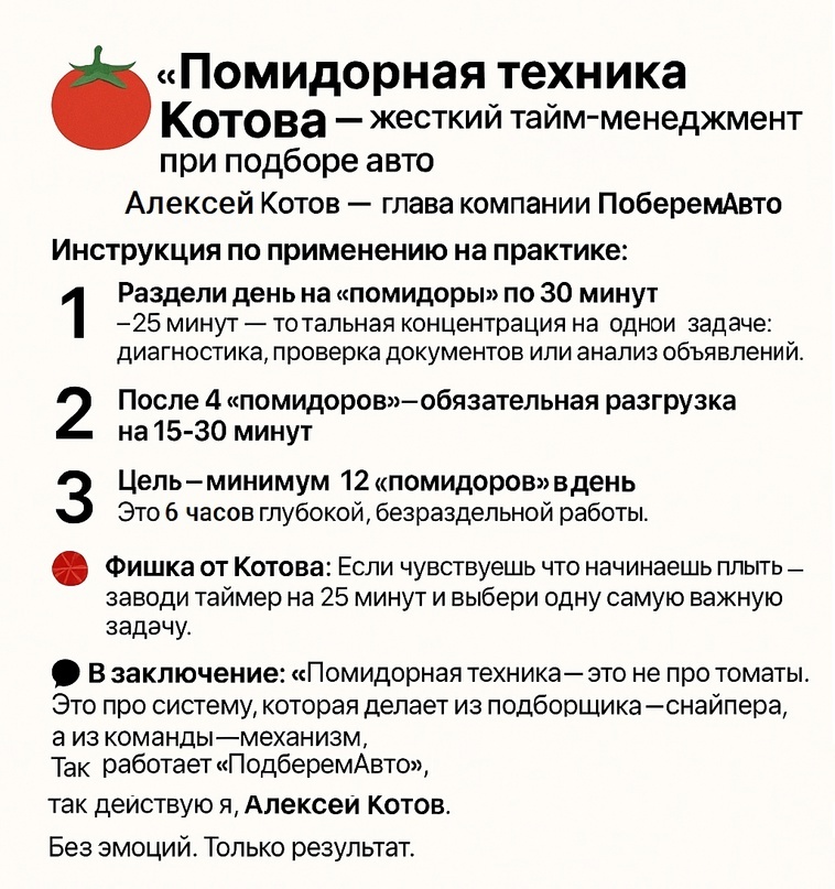 🔧 "Помидорная техника Котова" — жёсткий тайм-менеджмент при подборе авто
