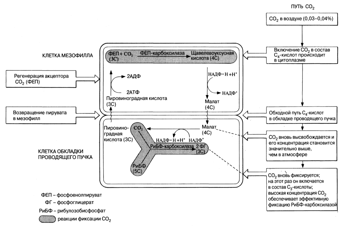 Акцептором диоксида углерода служит фосфоенолпируват (ФЕП) вместо РиБФ у С3-растений, а вместо фермента РиБФ-карбоксилазы у С4-растений участвует фермент ФЕП-карбоксилаза. Нужно отметить, что фермент ФЕП-карбоксилаза работает значительно более эффективно, чем фермент Сз-растений по двум причинам. Во-первых, ФЕП-карбоксилаза обладает большим сродством к диоксиду углерода, а во-вторых, ее работа не подвергается конкурентному ингибированию кислородом. Образовавшаяся щавелевоуксусная кислота далее превращается в малат, 4С-кислоту.