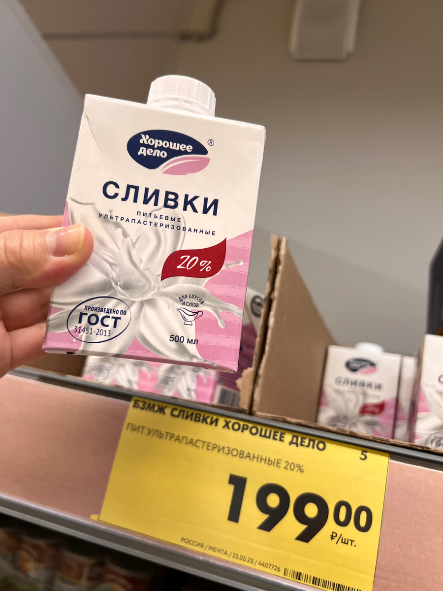 💁🏻♀️Вы просили показывать побольше продуктов! Так Вот сливки «Хорошее дело» ультрапастеризованные, 20% жирности, объёмом 500 мл, произведённые по ГОСТу — отличный вариант для кофе или десертов!