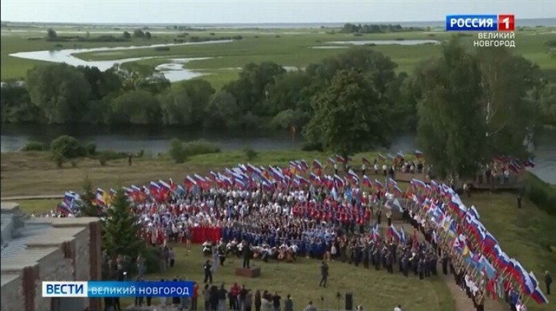 Ранним утром в День России более тысячи новгородцев и гостей города исполнили гимн нашей великой страны на Рюриковом городище
