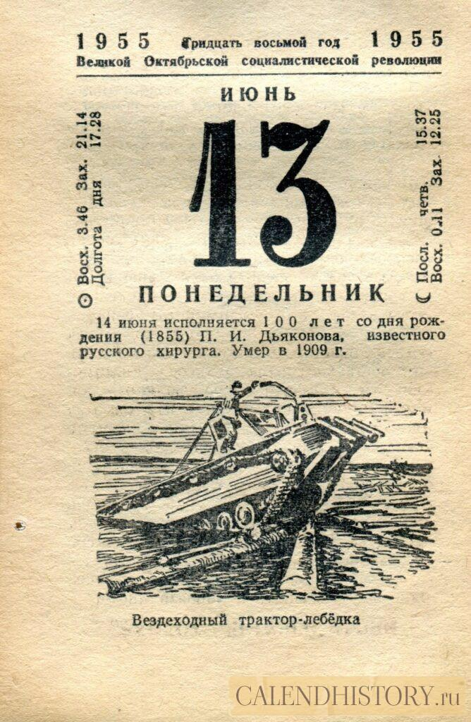 Итак, сегодня 13-июня и у нас на календаре 1955-й год. Перед нами листок советского календаря Политиздата. На календаре у нас понедельник - 13 июня 1955-го года. Вездеходный трактор-лебёдка 14 июня исполняется 100 лет со дня рождения (1855) П. И. Дьяконова, известного русского хирурга. Умер в 1909 г. *** Оборотную сторону листка этого календаря можно посмотреть у нас по ссылке на сайте. Другие листки советских календарей смотрите у нас на сайте - CALENDHISTORY.ru ПОСМОТРИТЕ ЕЩЁ ЛИСТКИ ОТРЫВНЫХ КАЛЕНДАРЕЙ: