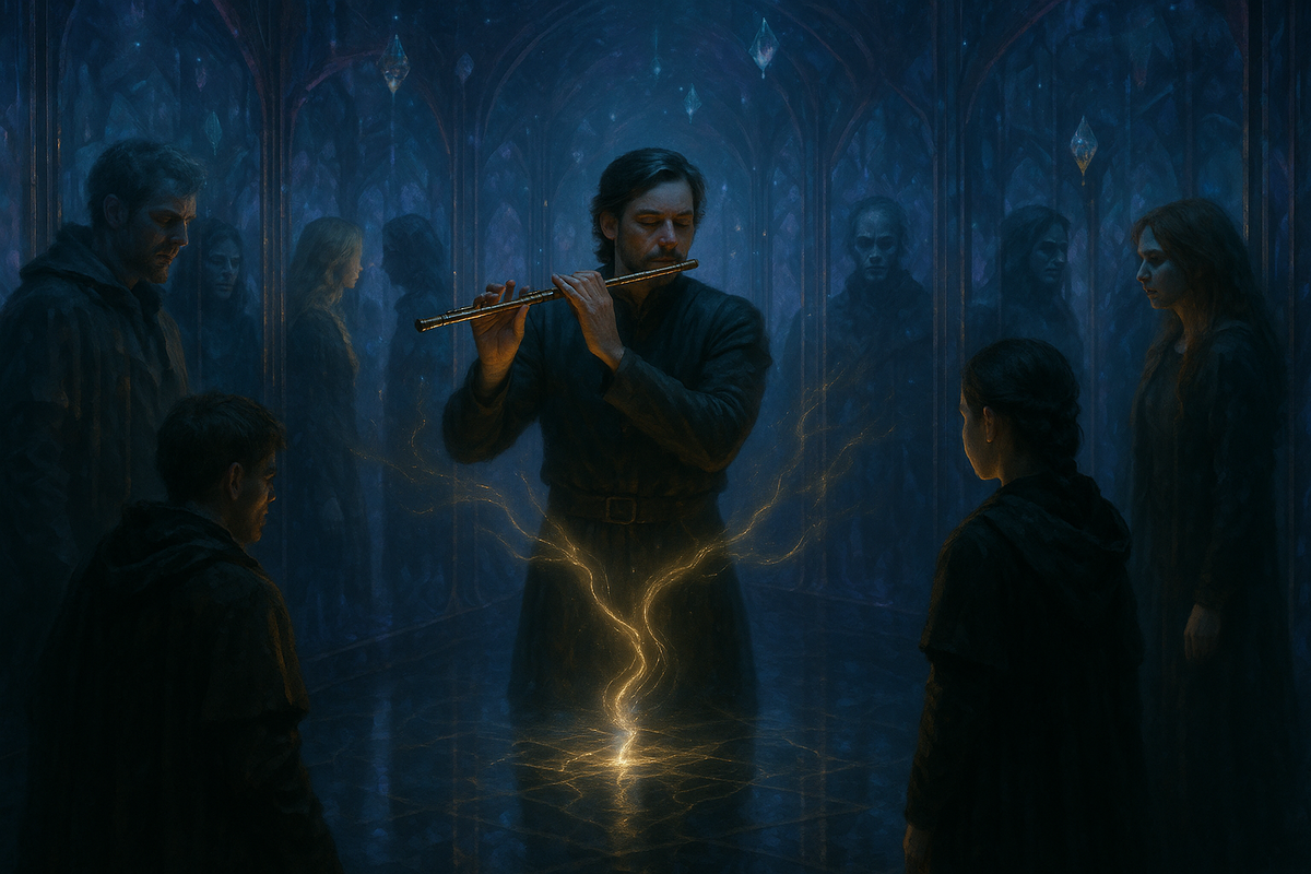 Мелодиус вплетается в её ритм. Он играет на флейте — не на настоящей, а на магической, сотканной из звука и света. Его мелодия проста, но звучит так, как будто её знают все с рождения. Пространство стабилизируется окончательно.
