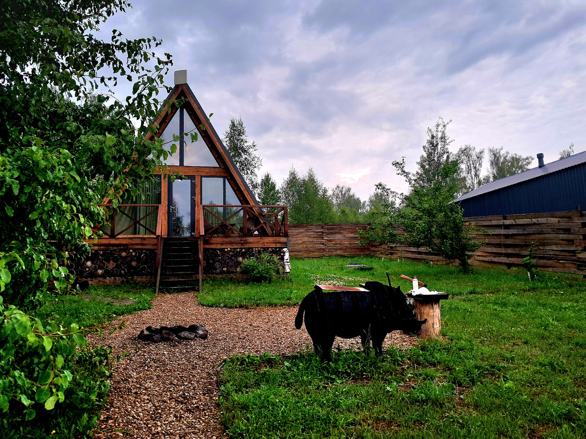 Бронировали не слишком заранее (за пару недель), так что выбор был не то чтобы очень большой. Выбрали вариант чуть дальше Серпухова: как раз на полпути между Москвой и Тулой. Если точнее, в деревне Якшино. Местечко называется претенциозно: дачный клуб Якшино. Ну ОК.:) Клуб состоит из нескольких домиков (каждый с отдельной территорией и отдельным входом, за забором, соседи не подглядывают). Правда, домики называются хитрым словом афрейм. Как я поняла, это из-за формы — они действительно А-образные.