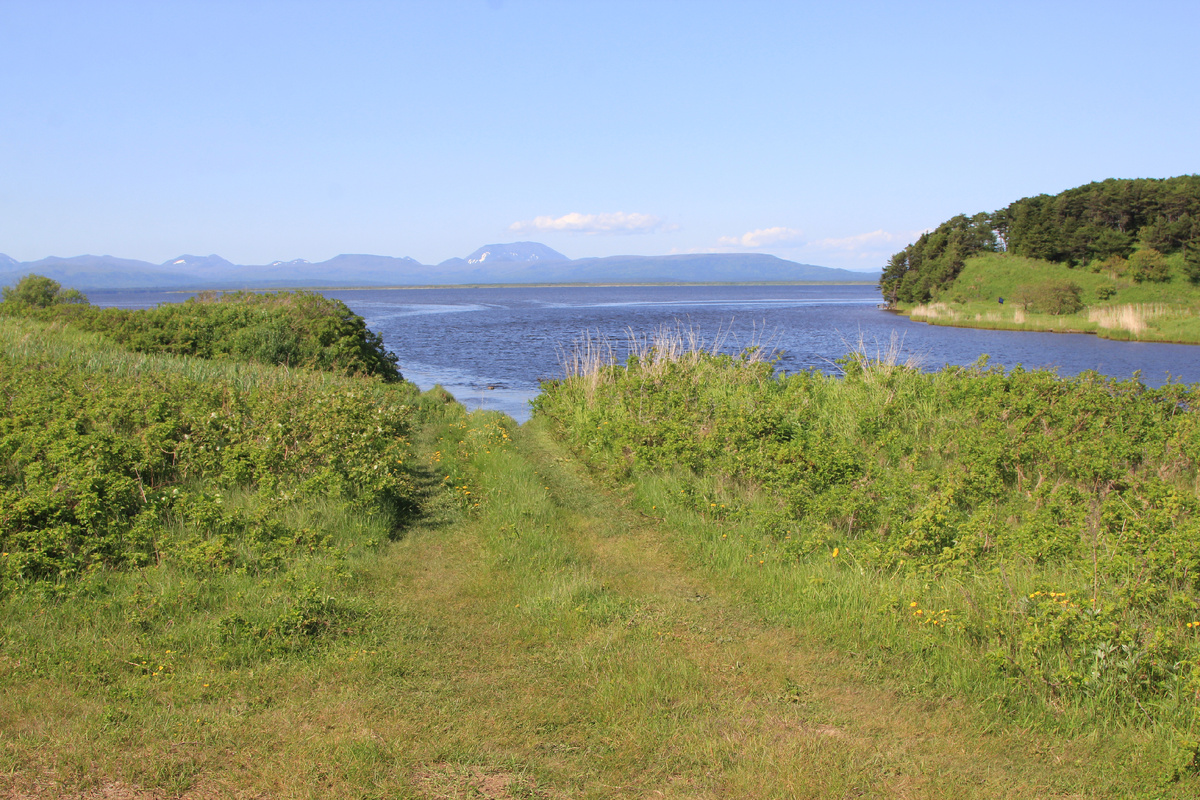 Это место давно, уже несколько лет, было у нас в списке обязательных к посещению. Да никак не получалось. Вчера мы наконец-то урвали у сахалинского июня солнечный день и докатились до западного побережья с Красногорском и Айнским озером! Айнское озеро находится в семи километрах к северу от села Красногорск, проехать можно по песчаной дороге, которой постепенно становится улица Калинина. Поездку мы завершили на большой поляне с разными домами непонятного назначения, беседками и множеством отдыхающих сограждан. Виды вокруг раскинулись великолепные: горы Краснова, Ичара и другие вершины западного Сахалина. Нам повезло - было ясно, ничто не мешало обзору красот. Берега достаточно топкие, поэтому к воде мы спускались эпизодически. Учёные провели тут не одно исследование и выяснили, что кто только в Айнском не живёт: колюшки, корюшки, камбала, караси, гольцы, горбуша, кунджа... Даже рыба-лапша имеется! Рыбаки рассекали по Айнскому на моторных лодках; у берега плескались мальки. Собствен