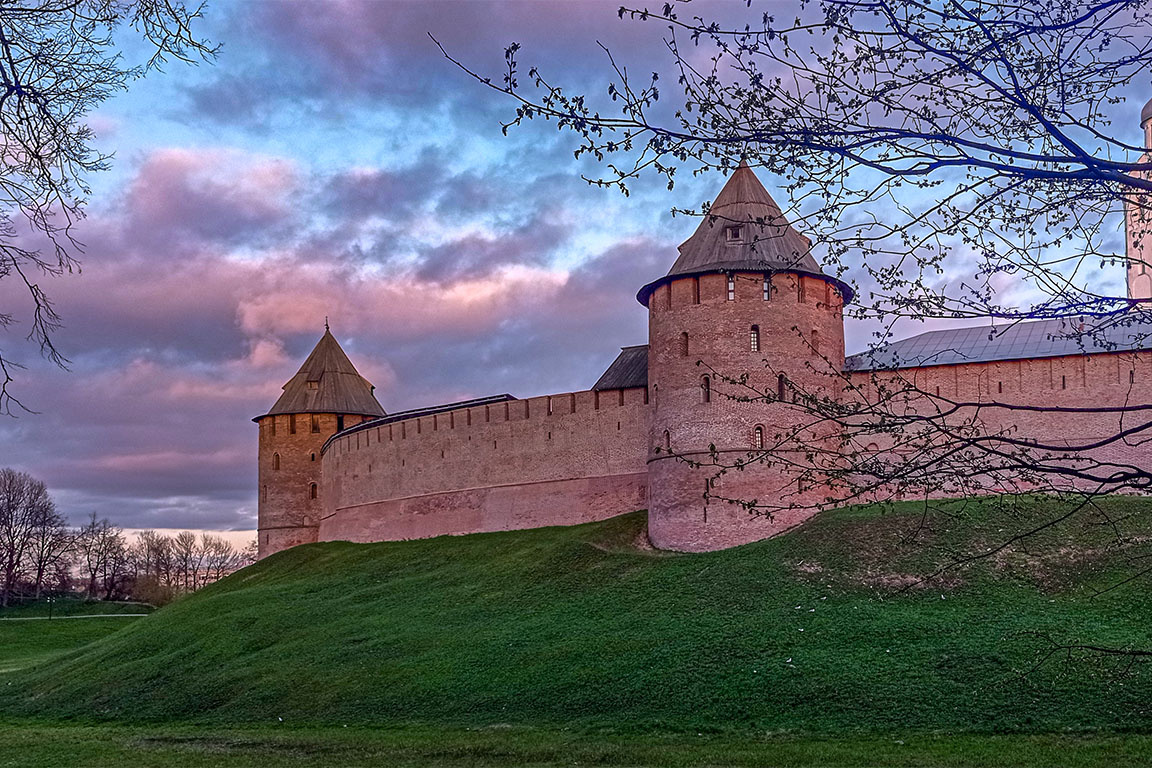 Новгородский кремль правильнее называть непривычным словом "детинец" Стена детинца Башни детинца При внимательном рассмотрении можно увидеть, что стена надстроена метра на три-четыре. Раньше мерлоны были типа "ласточкин хвост", как у московского Кремля, сейчас они только на башнях остались. И еще на стене видно много "заплаток" Замки Памятник "Тысячелетию России". Изображен на пятирублевой купюре Тут вот поверженные печенег с половцем и еще рыцарь Ливонского ордена 1944 год. Во время оккупации нацисты хотели вывезти памятник и разобрали его на части Фотография, которую сделал корреспондент Георгий Петрусов после освобождения Новгорода в 1944 году.