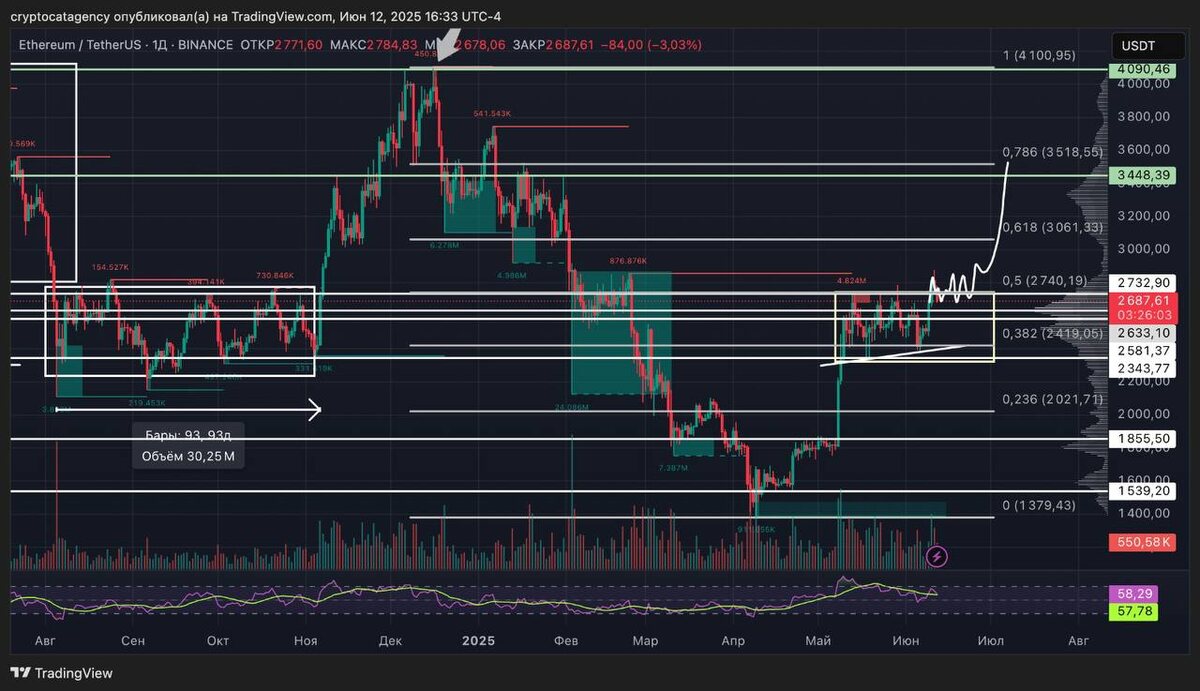 Цена сейчас находится в диапазоне 2581$ - 2343$, который ранее был зоной поддержки. Раньше, когда цена падала до этих уровней, она часто разворачивалась вверх - участники рынка начинали покупать. Сейчас цена находится в этом же диапазоне уже больше месяца (консолидируется). Вчера была попытка выйти вверх из этого бокового движения, но цена столкнулась с продавцами - началось давление на продажу, и цена снова опустилась. На данный момент, для продолжение восходящего движения, важно удержать цену выше уровня 2732$, который сейчас стал уровнем сопротивления. Если это удастся, то есть шанс продолжить рост цены к следующей зоне сопротивления - в диапазон 3448$ - 4090$. В общем и целом, точки входа по Эфиру можно искать в диапазоне 2581$ - 2343$ с целями 3061$, 3448$, 4090$. 👉 Trading View 👉 Telegram