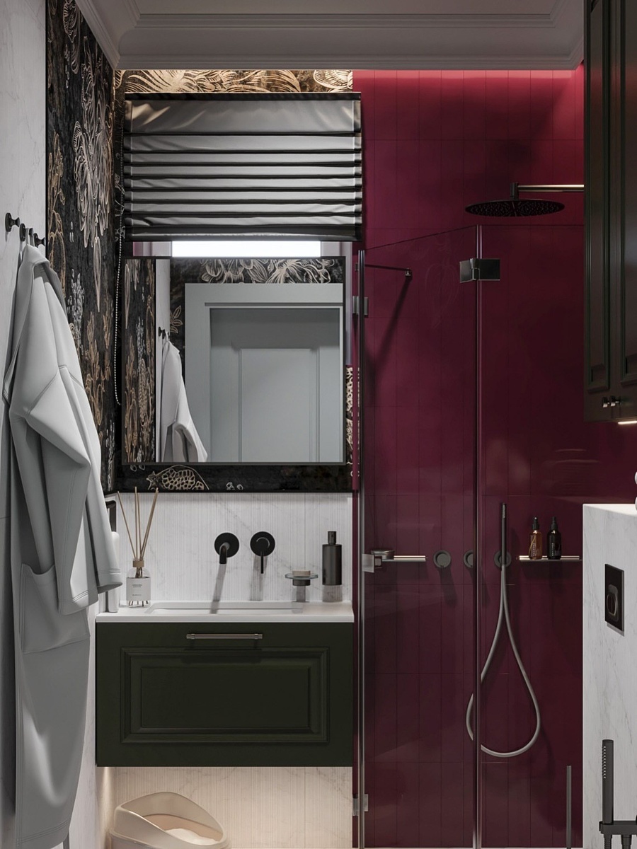 📎 Концепция Это не просто санузел, а маленькая арт‑галерея рядом с гостевой спальней. Хозяева хотели контраст с более спокойной «мастер‑ванной», поэтому мы выбрали сочную палитру, смелую геометрию плитки и динамичную подсветку. 🖇️ Что удалось • Полноценная функциональность: разместили четыре зоны - душевую с трапом под плитку вровень с полом - подвесной унитаз - столешницу с раковиной‑чашей и лотком для кота под ней 🐈 - гигиенический душ. • Визуальная лёгкость: прозрачная стеклянная перегородка и грамотное использование каждого квадратного метра убирают «визуальный шум», оставляя пространство открытым и воздушным. • Цвет как эмоция: акцентная стенка облицована яркой керамической плиткой с глянцевым эффектом, остальные поверхности — спокойный структурный на полу и матовый на полу нейтрал, чтобы подчеркнуть главный тон и не перегрузить интерьер. 😍Впечатление Гость ощущает приватность и заботу хозяев, при этом попадает в неожиданно яркое, «инстаграмное» пространство — то