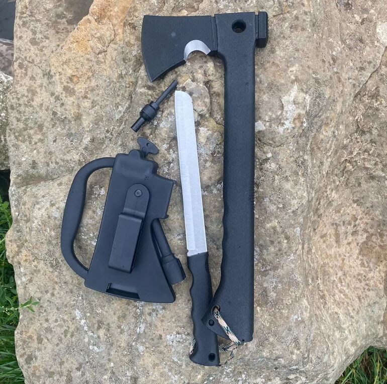 Чтобы обеспечить сохранность топора с ножом во время транспортировки, был разработан специальный чехол. Его можно закрепить на поясе. В чехле также есть место для огнива, что делает этот набор инструментов ещё более полезным. Топор изготовлен из высококачественной стали марки У7. Его длина 370 мм, а вес — 0,9 кг.