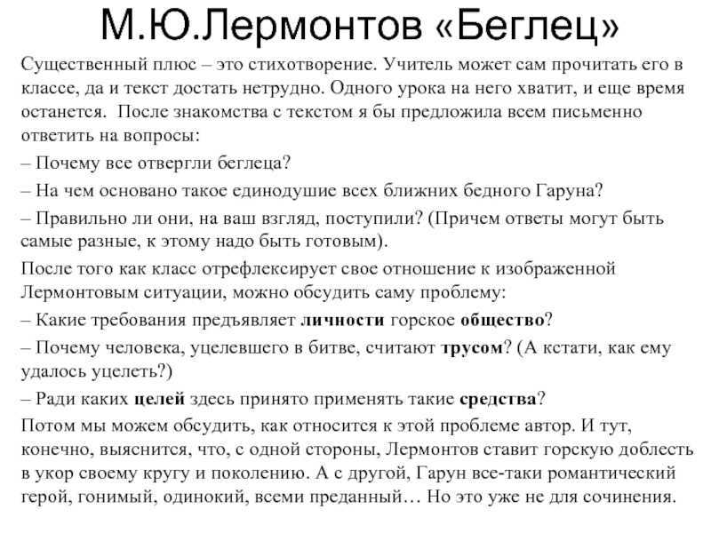 Поэма также отражает личные переживания Лермонтова, который, будучи сосланным на Кавказ, глубоко проникся этим регионом и его культурой. «Беглец» — это не только дань романтической традиции, но и размышление о цене чести и невозможности примирения с обществом.