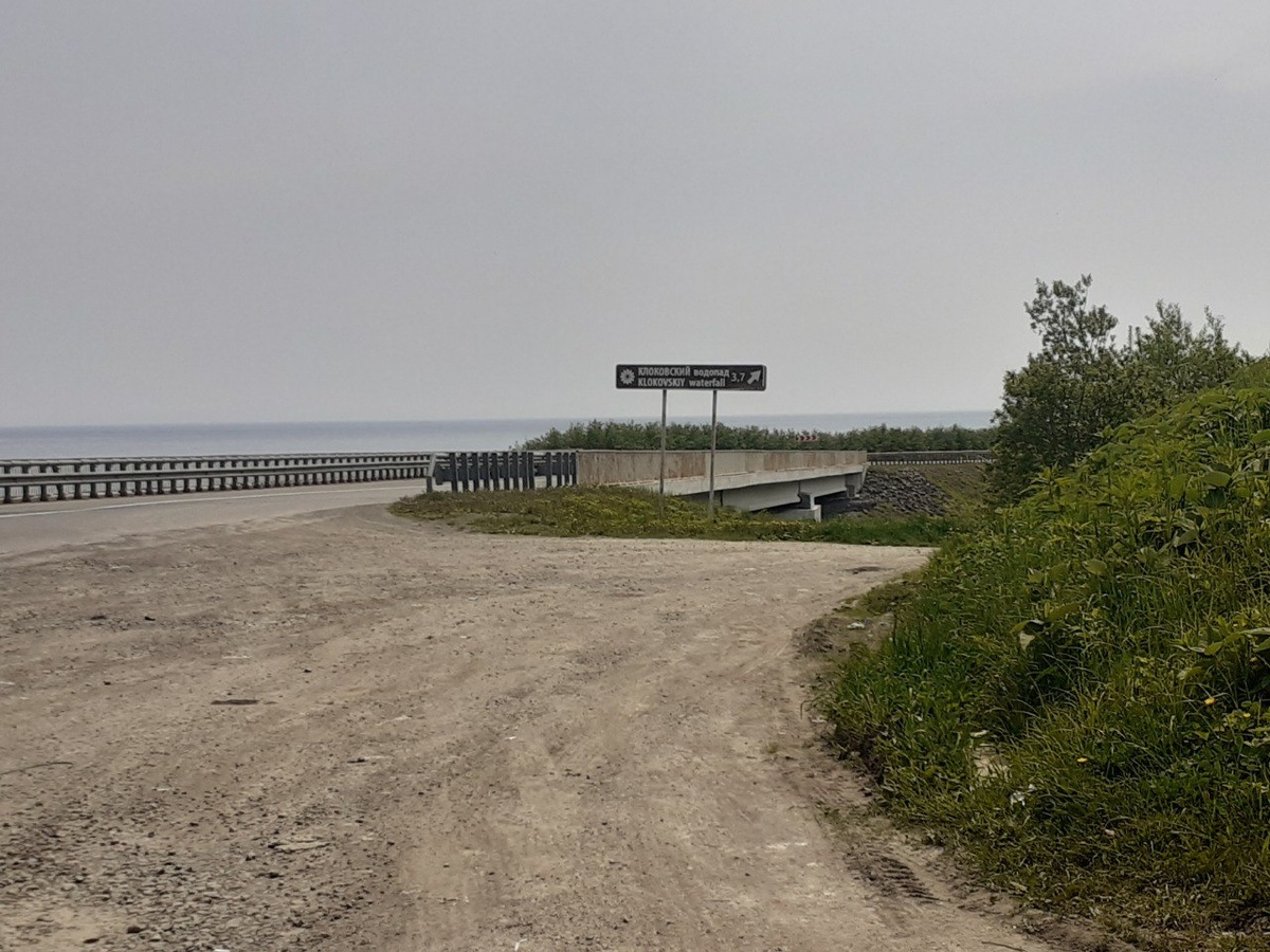 Один из самых высоких водопадов острова Сахалин - Клоковский - находится в Макаровском районе. Он, пожалуй, самый доступный: от дороги до него каких-то 500 метров, не надо продираться сквозь кусты, как на Уюновский, и не пересекать холодную речку вброд, как на Хомутовский. Идёшь себе вверх и идёшь. Мы доехали до Клоковского на машине из Южно-Сахалинска. Не доезжали до официального указателя, а запарковались примерно на 193-м километре вдоль дороги. Можно спуститься и вниз, к живописнейшему морскому берегу, и поставить машину там. Потом мы прошли по камням вдоль моря, под автомобильным мостом, поднялись по лестнице к мосту железнодорожному и, перейдя его, спустились к дороге, ведущей на водопад. Кто-то съезжает на эту грунтовку с федеральной трассы, но умные люди подсказали нам, что этого делать не следует - слишком долгий объезд. А попутчики заявили, что ещё и вляпались в грязь, бросили машину в кустарнике и всё равно дошли до старта пешком. А официальная парковка Клоковского водопада