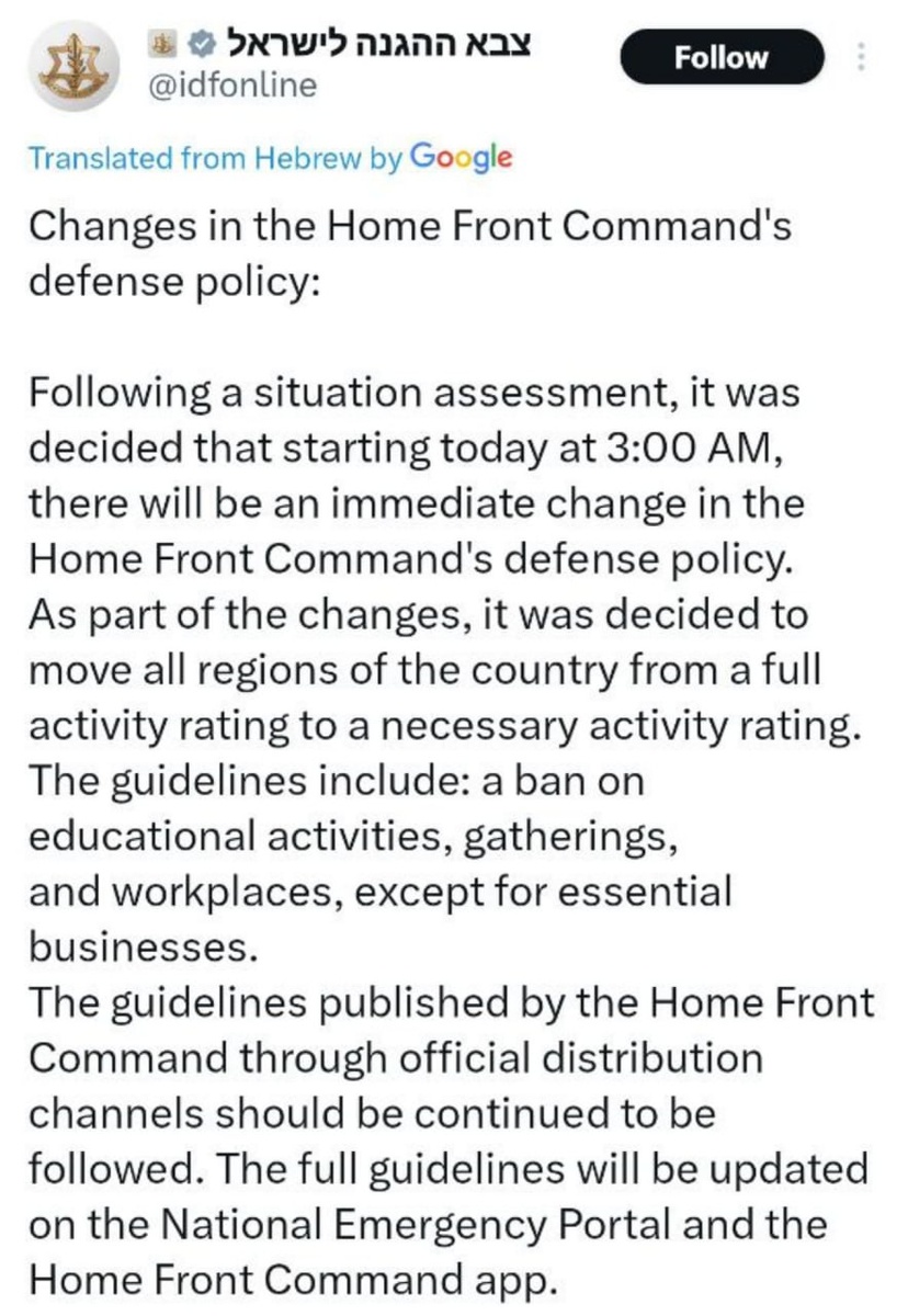 ❗️IDF CONFIRMS state of emergency Immediate ban on all activities save for essential businesses
