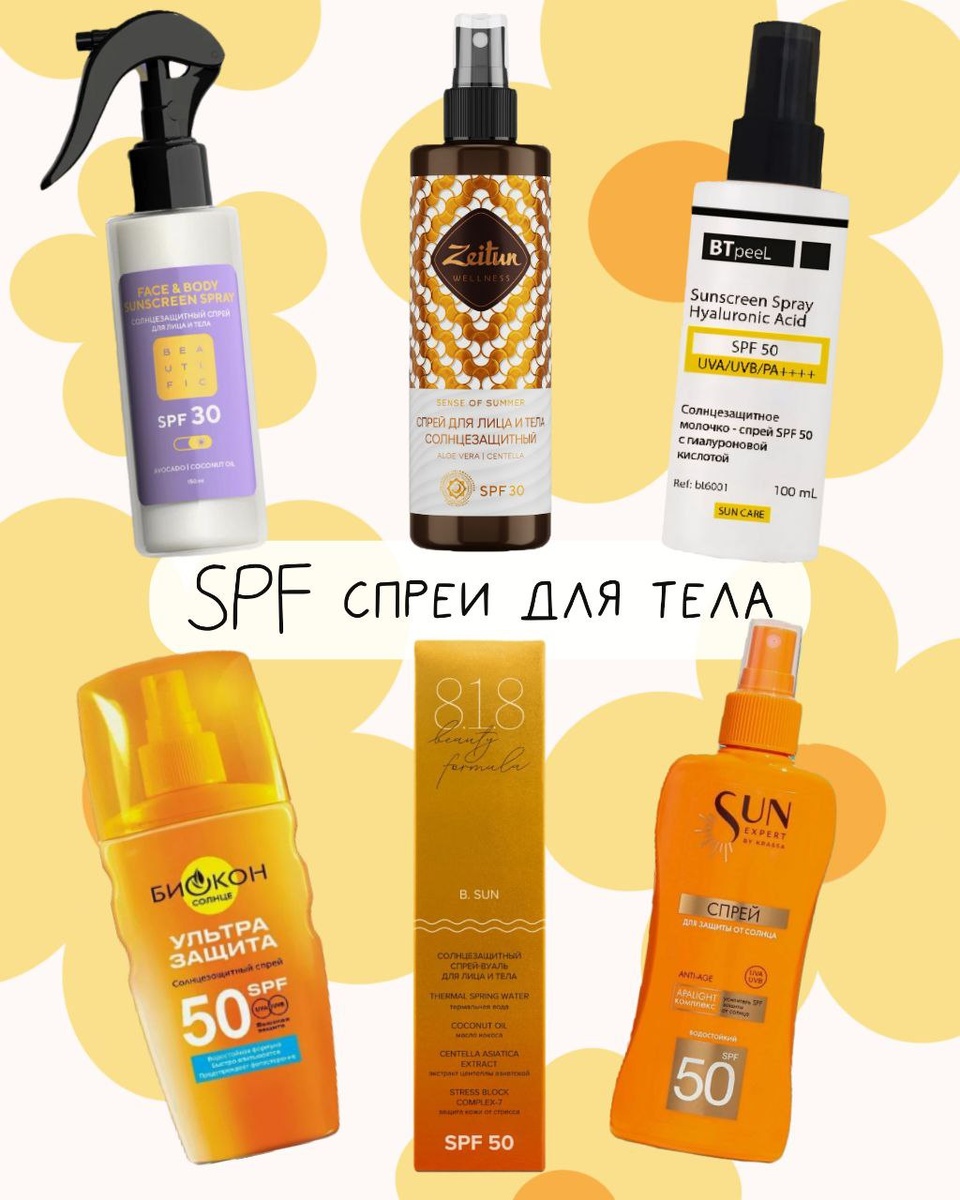 Когда хочется лёгкости и комфорта, а не размазывать тяжёлый крем по жаркому телу — на помощь приходят SPF-спреи Они быстро наносятся, не липнут, легко обновляются в течение дня и помещаются даже в небольшую сумку. И, главное, у российских брендов наконец есть достойные варианты: • Beautific — лёгкий спрей с маслами авокадо и кокоса. Никакой липкости, только комфорт и вкусный аромат • Zeitun — целая сыворотка в спрее. В составе масла, керамиды, пантенол и даже гидролизованный шёлк. Кожа после него реально гладкая и напитанная. Для сухокожиков • BTpeel — отлично подходит и для защиты от солнца, и для ухода после процедур (пилинги, лазеры). Высокая защита, плюс витамин Е и гиалуронка. Впитывается без следа • 818 Beauty Formula — для чувствительной кожи. Экстракт центеллы, пантенол, аллантоин, витамин Е. Полный набор для тех, кто хочет и защитить, и восстановить кожу после загара • Krassa — формула с гидроксиапатитом и витаминами А, Е, F. Не выбеливает, не забивает поры, водостойкий