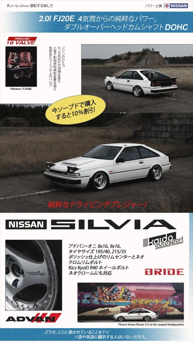 Nissan Silvia спортивное купе выпускавшееся с 1965 по 2002 годы. Купе строилось на платформе Nissan S. Четвёртое поколение S12 производился с августа 1983 по 1988 год. 🚗Ряд различных двигателей устанавливались на шасси S12, в зависимости от года выпуска и конкретного рынка. Эти двигатели перешли от предыдущих поколений, и, в некоторых случаях, стали основой для будущих двигателей. Такие двигатели как CA18DET с головкой блока цилиндра DOHC. 🏆Silvia S12 также получили некоторый успех в ралли, в основном в гонках на выносливость. Пятое поколение 🚗Silvia S13, появившаяся в середине 1988 года, пользовалась огромной популярностью в Японии. С появлением она была признана автомобилем года в Японии. S13 была одним из первых случаев начала установки многорычажной задней подвески. Также впервые стала доступна система управления четырьмя колёсами, известная как HICAS-II. На это поколение изначально устанавливались двигатели CA18DE и CA18DET, перешедшие с предыдущего поколения, с добавлени