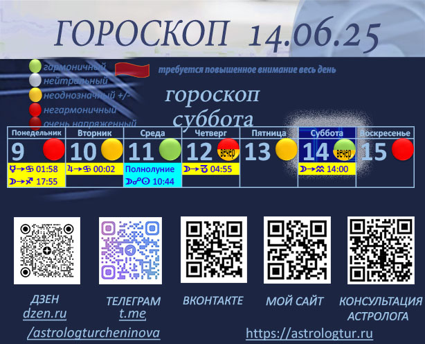 Напомню, завтра кульминация напряженного аспекта Марса с Ураном (кульминация аспекта 15.06.25, влияние минимум с 14.06.25 по 17.06.25), его влияние уже есть и сегодня, поэтому осторожнее надо быть во всём, и все эти дни. Особенно внимательным надо быть, в связи с этим аспектом, в то время, когда одновременно есть еще какое-то напряженное влияние, как например, сегодня вечером.
