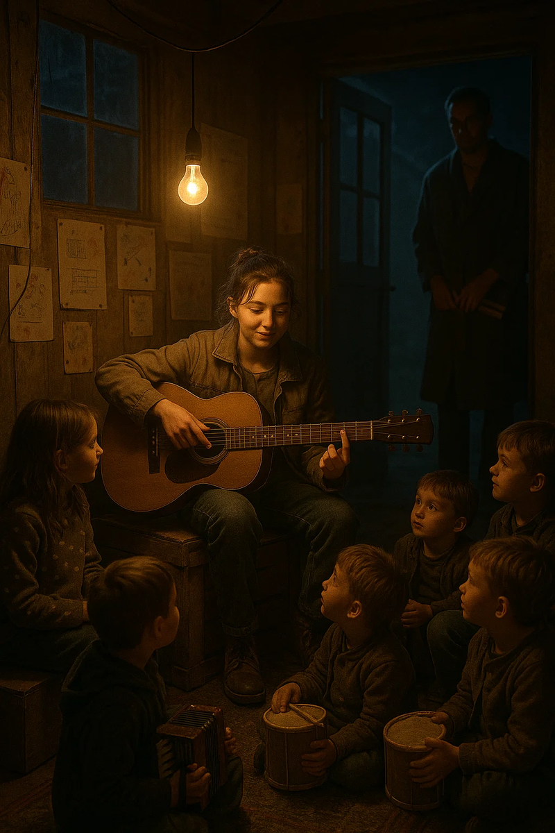 Отец нашёл выбитую доску, заглянул. Не рок-группа. На полу – семеро малышей лет от шести до девяти, в разноцветных пижамах; у каждого в руках что-нибудь музыкальное: погремушка, старый бубен, пластмассовая дудочка, а крошка Даша била кисточкой по коробке из-под обуви. Лиза, в клетчатой рубахе, держала гитару соседа-студента. На пыльном стуле стояли разлинованные тетрадки: «До – ре – ми».