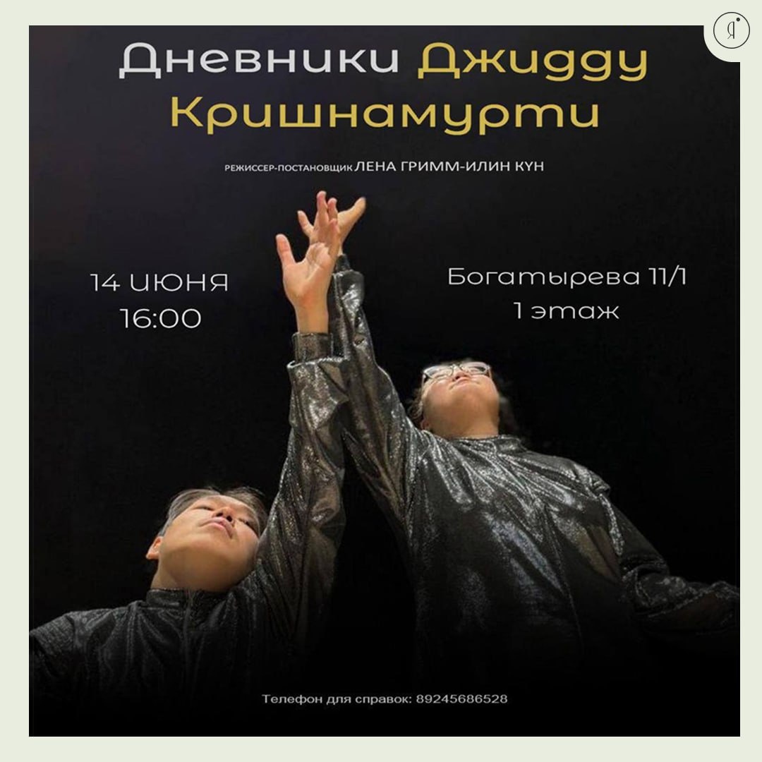 Дневники Джидду Кришнамурти #Втеатре Спектакль победитель конкурса "Полюс. Золотой сезон" и участник VI Фестиваля театров Дальнего Востока "Дневники Джидду Кришнамурти" Инклюзивного театра "Алгыс", режиссёр-постановщик Лена Гримм-Илин КYH Музыкальное и вокальное сопровождение Айталина Баттахова и Лена Гримм-Илин КYH 14 июня | 16:00 Богатырева, 11/1 +79245686528 Online Якутия | Подписаться
