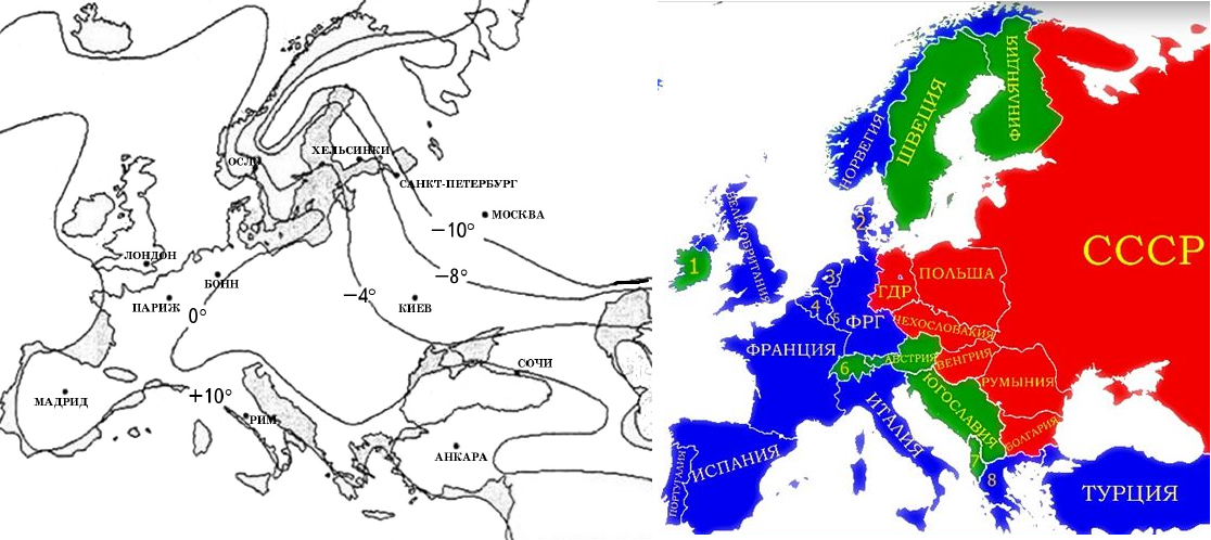 А.Паршев «Почему Россия – не Америка»: карты 1.изотермы января на территории Европы, 2.распределение европ.стран по военно-политическим блокам. «Нулевая изотерма делит Европу на зону НАТО и зону «соц.лагеря» и нейтральных стран». Движение НАТО на восток совпадает с глобальным потеплением. «Генерал Мороз» отступает: холодная война 50-х, оттепель 60-х, потепление отношений 80-х.. Возм., средневековая Мировая Империя русов смогла создаться не только "супероружием" из ярославского метеорита 1421 г. (дамасская сталь), но и глобальным похолоданием.