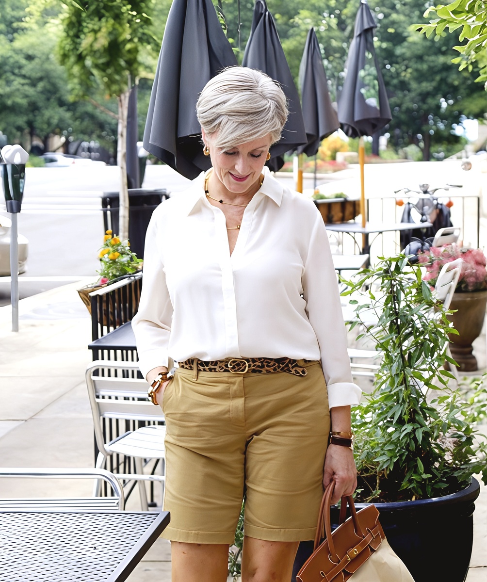 Берем белую рубашку — такую, которую можно носить навыпуск или заправлять. Добавляем бежевые шорты. Но не простые! Со стрелками или защипами. Эти маленькие детали кроя сразу делают обычные шорты элегантными.