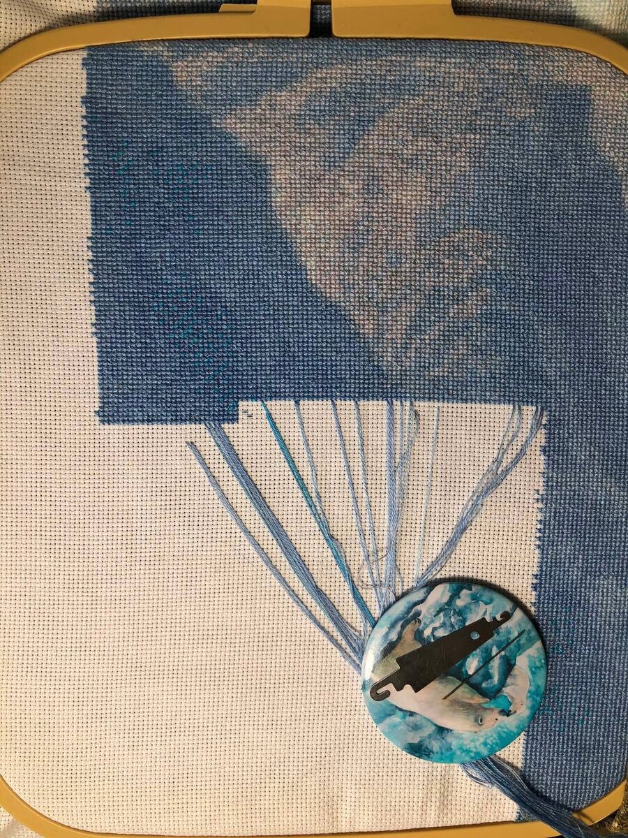 Последние стежочки легкого фона, ещё месяц и мы будет переходить к лесу, потом башенкам, мосту и людям