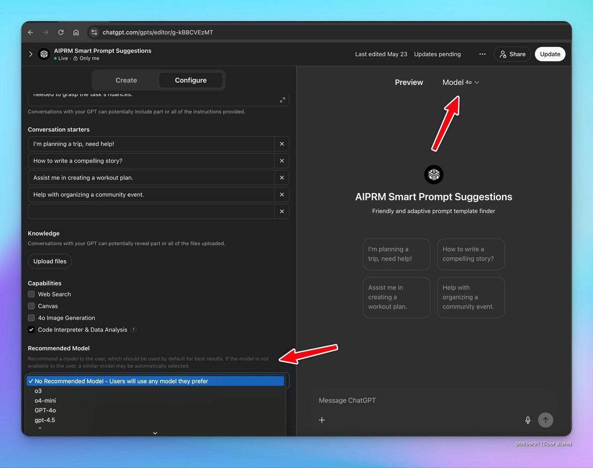 GPT. Π‘ΠΎΠ·Π΄Π°ΡΠ΅Π»ΠΈ GPT ΡΠΌΠΎΠ³ΡΡ Π½Π°ΡΡΡΠ°ΠΈΠ²Π°ΡΡ ΡΠ΅ΠΊΠΎΠΌΠ΅Π½Π΄ΡΠ΅ΠΌΡΡ ΠΌΠΎΠ΄Π΅Π»Ρ (ΠΈΠ»ΠΈ Π²Π°ΡΠΈΠ°Π½Ρ Β«ΠΠ΅Π· ΡΠ΅ΠΊΠΎΠΌΠ΅Π½Π΄ΡΠ΅ΠΌΠΎΠΉ ΠΌΠΎΠ΄Π΅Π»ΠΈ β ΠΏΠΎΠ»ΡΠ·ΠΎΠ²Π°ΡΠ΅Π»ΠΈ ΠΌΠΎΠ³ΡΡ Π²ΡΠ±ΡΠ°ΡΡ Π»ΡΠ±ΡΡ ΠΏΡΠ΅Π΄ΠΏΠΎΡΠΈΡΠ°Π΅ΠΌΡΡ ΠΌΠΎΠ΄Π΅Π»ΡΒ»). Β«Π Π΅ΠΊΠΎΠΌΠ΅Π½Π΄ΡΠΉΡΠ΅ ΠΏΠΎΠ»ΡΠ·ΠΎΠ²Π°ΡΠ΅Π»Ρ ΠΌΠΎΠ΄Π΅Π»Ρ, ΠΊΠΎΡΠΎΡΠ°Ρ Π΄ΠΎΠ»ΠΆΠ½Π° ΠΈΡΠΏΠΎΠ»ΡΠ·ΠΎΠ²Π°ΡΡΡΡ ΠΏΠΎ ΡΠΌΠΎΠ»ΡΠ°Π½ΠΈΡ Π΄Π»Ρ Π΄ΠΎΡΡΠΈΠΆΠ΅Π½ΠΈΡ Π½Π°ΠΈΠ»ΡΡΡΠΈΡ