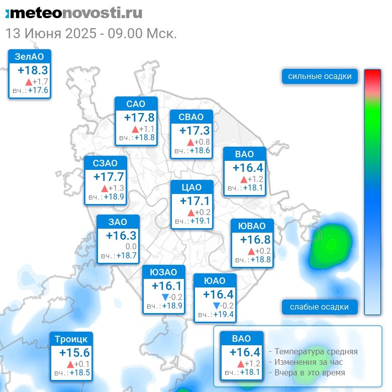 В 9:00 в Москве было от +15°C до +18.9°C, средняя температура +16.9°C #погода #Москва #лето #температура #13июня #пятница Перейти на сайт Прогноз погоды на 14 дней