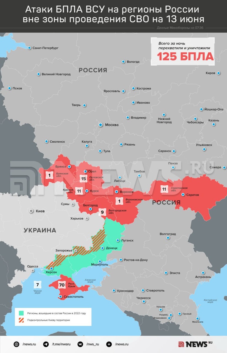 За ночь российская ПВО уничтожила 125 украинских дронов, сообщили в Минобороны. Над Крымом сбито 70 БПЛА, над Орловской областью — 15, по 11 — над Курской и Саратовской областями, девять — над Белгородской областью, семь — над Черным морем, по одному — над Брянской и Воронежской областями. ⭕️ Подписаться | Прислать новость | Буст