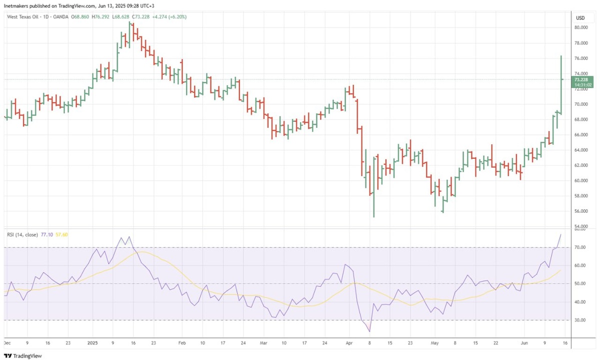 Нефть прибавляет более 6% на фоне ударов Израиля по Ирану и возможных ответных действий.