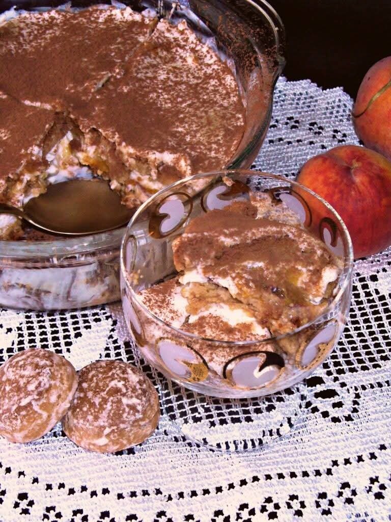 Всем привет! Сегодня пройдёмся по сладкому) * Жара, а сладкого хочется? На помощь приходят десерты без выпечки, готовить их очень просто, не жарко и не хлопотно. Вот, например такой десерт, я его назвала " а - ля тирамису, по русски") * сырковая масса с ванилином - 1 пачка, 240 гр, * йогурт по - домашнему, без наполнителя, с сахаром - 300 гр, * персики свежие - 3 штуки, небольшого размера, * пряники "малютка" - 150 - 200 гр. * какао для посыпки. Для этого десерта лучше брать пряники небольшого размера, с ними проще работать, легче уложить в форму. * пряники разрезать вдоль, на две части. * персики вымыть, удалить кожицу и нарезать небольшими дольками. * йогурт и сырковую массу взбить миксером, в однородную, пышную массу - крем. * в форму выложить небольшой слой крема, * затем выложить слой пряничных половинок. * сверху пряников выложить дольки персика, * выложить слой крема, * еще один слой пряничных половинок, * закончить слоем крема. Форму с десертом затянуть пищевой пленкой и ос