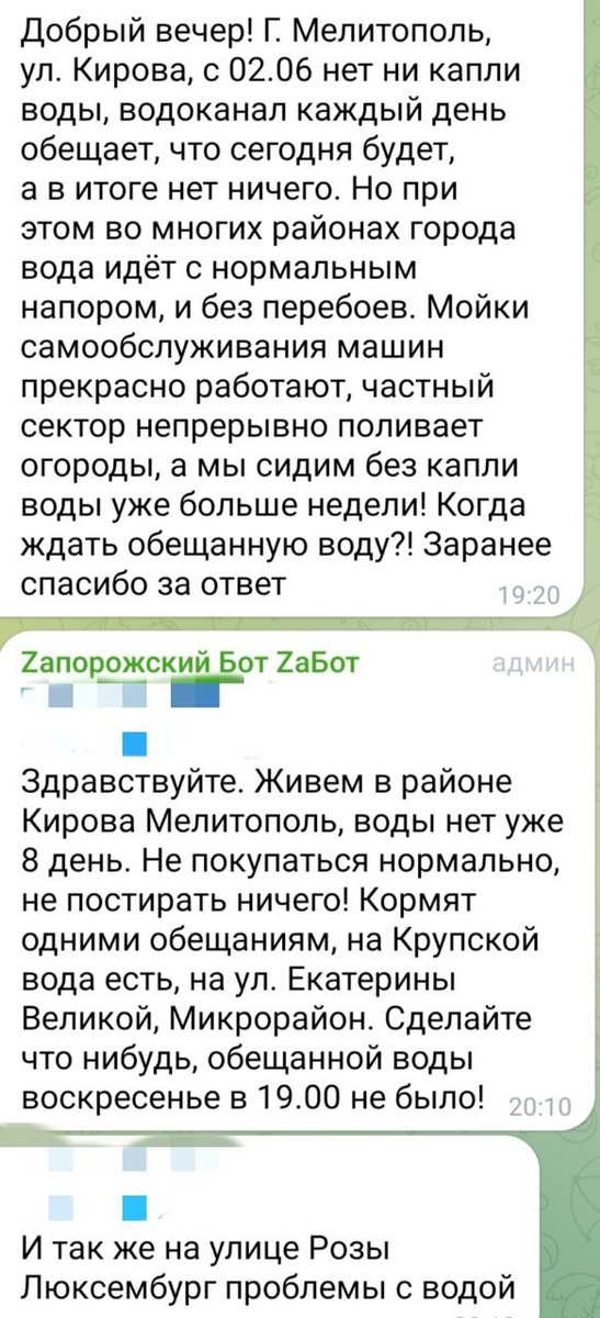 Её подвоз власти решили не организовывать. Последние новости Запорожья от 13 июня. Проблемы с водоснабжением в Запорожской области достигли апогея. Многие жители Мелитополя, Бердянска и других населённых пунктов региона без воды уже более недели. Об этом рассказал Владимир Рогов в Telegram-канале «Рогов. Глас Народа». Звонки в водоканал, по словам местных жителей, ни к чему не приводят: сотрудники разводят руками и говорят «просто ждать». Содействия со стороны властей тоже никакого нет: подвоз питьевой воды не был организован. В автоматах воды тоже нет. В страшную жару люди не могут сходить в душ, туалет, постирать вещи, помыть посуду. Особенно тяжело старикам и семьям с детьми. Если воду и включают, то она едва доходит до третьего этажа. И то – ржавая, с мутным осадком. Жители Бердянска рассказывают, что отсутствие воды им объяснили началом летнего сезона: наполняются бассейны на базах отдыха, аквапарки, к тому же, многие люди поливают огороды. Получается, по логике местных властей, з