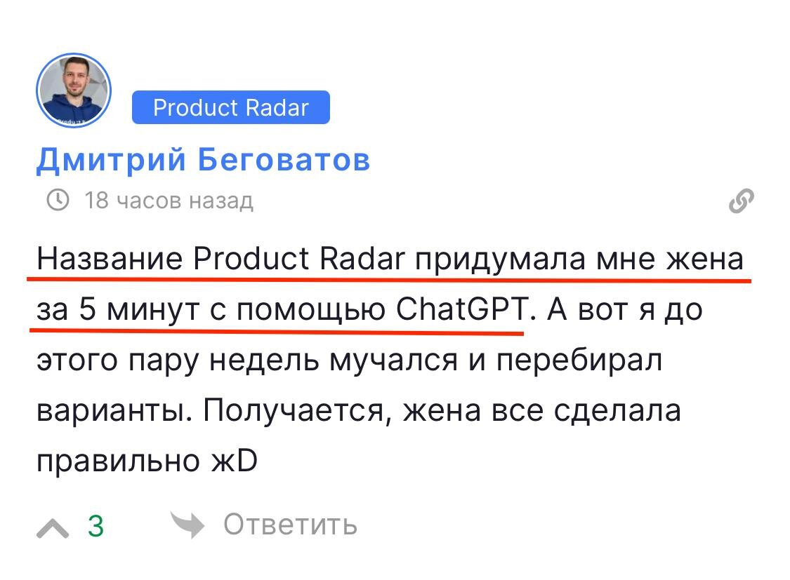 ⚡️Флешмоб: расскажи, как появилось название твоего стартапа! Вчера в блогах на Product Radar вышла статья нашего охотника Дмитрия Гарника о том, что долгие поиски «правильного» имени для стартапа – это бесполезное занятие. Дима собрал аж 6 способов подобрать подходящее название быстро и соврешенно бесплатно. А мы решили, что это прекрасная возможность узнать ВАШИ истории и подходы к выбору названия для стартапа. 📣 Запускаем флешмоб! Расскажите, как появилось название вашего проекта? Что вдохновило? Что не сработало? Как поняли, что нашли лучший вариант? 💬Оставляйте свой рассказ в комментариях под статьей Димы и делитесь в чате канала с хештегом #названиестартапа (а лучше и там и там) – пусть ваши истории вдохновят других и лучше расскажут о вашей личности основателя! Если вы еще в поиске, тоже пишите! Попробуем использовать коллективный разум 😁 ➡️ Переходите в комментарии и пишите: https://productradar.ru/blog/nazvanie-dlya-startapa-besplatno-i-bystro/#comments