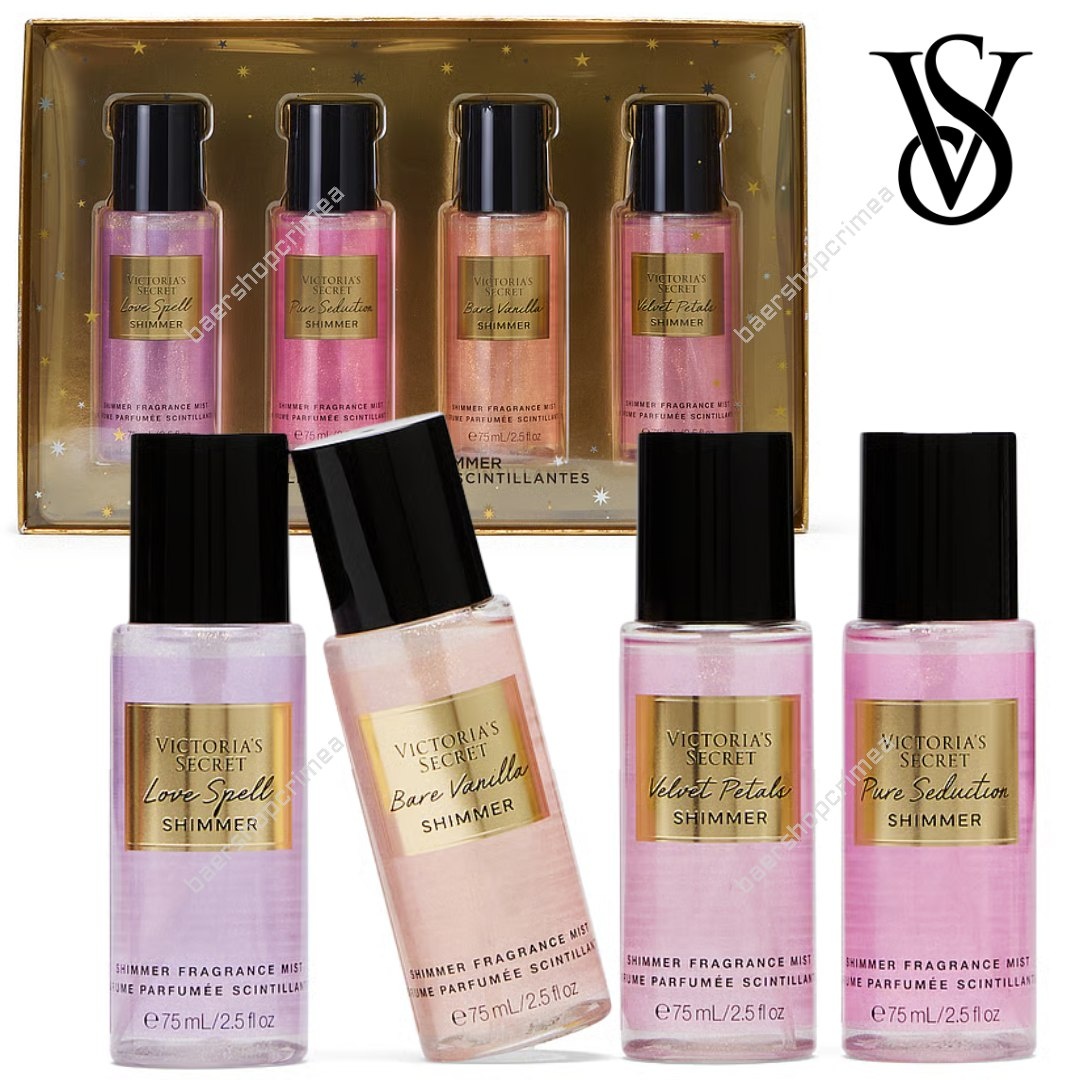 #Victorias_Secret 🇺🇸 Набор мистов с шиммером для тела (женский раздел) 4375₽ ➡️ 2124₽ + вес Velvet Petals (Цветы, миндальная глазурь.), Pure Seduction (Слива, фрезия.), Bare Vanilla (Ваниль, кашемир, кожа.), Love Spell (Вишня, персик.). для заказа писать 🖤@dianabrill
