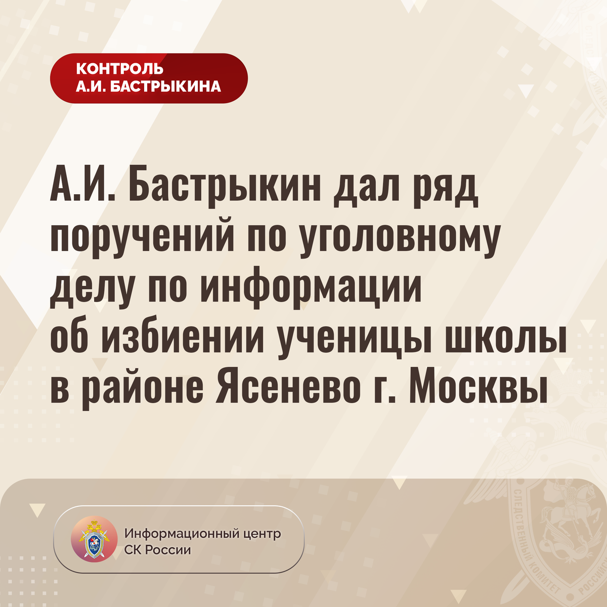 А.И. Бастрыкин дал ряд поручений по уголовному делу по информации об избиении ученицы школы в районе Ясенево г. Москвы