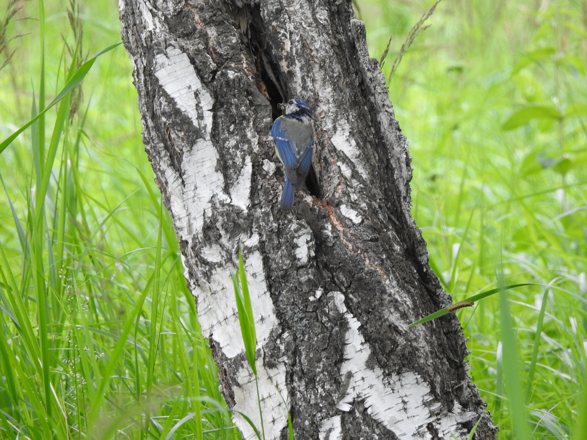 Вчера на моей выездной орнитологической экскурсии в Белоярский район Свердловской области нам удалось сделать уникальное наблюдение. Мы нашли дупло с гнездом князька (Parus cyanus белой лазоревки) и лазоревки Parus caeruleus, где подрастают гибриды — лазоревки Плеске. За полчаса наблюдений родители раз пять прилетали с кормом, и нам показалось, что князек - мама, потому что белая лазоревка проводила с птенцами больше времени, по полминуты примерно, в то время как лазоревка залетала буквально на секунды. То, что эти два вида могут вступать в связь, известно еще с конца позапрошлого века. Птицы-гибриды были описаны орнитологом Михаилом Мензбиром в 1877 году и получили название «князёк Плеске» или «лазоревка Плеске». (Parus pleskei, или Cyanistes pleskei). В окрестностях Екатеринбурга первые находки князьков с жёлтой окраской груди относятся к началу 2000-х. Птички могут выглядеть как князьки с жёлтой грудью — от небольших бледно-жёлтых пятен в верхней части груди до полностью желтогрудых