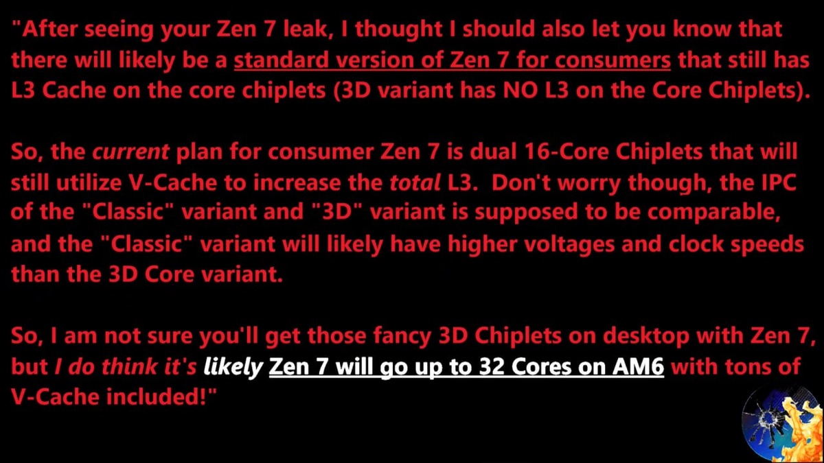 Инсайдер и автор YouTube-канала Moore's Law Is Dead поделился свежими деталями о десктопных процессорах AMD на базе архитектуры Zen 7. Компания готовит две версии чипов: стандартную с классическим L3-кэшем на ядрах и применением V-Cache для расширения общего объёма кэша, а также с «3D-ядрами», в которых L3-кэш на самих ядрах отсутствует. Обе версии будут иметь сопоставимый IPC, однако стандартные модели получат более высокие частоты благодаря увеличенному напряжению. Флагманы получат до 32 ядер (два 16-ядерных чиплета) и выйдут на новом сокете AM6.