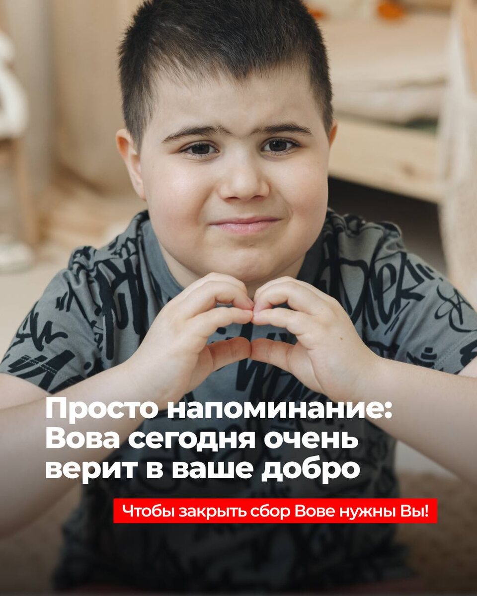 Дорогие волшебники, остался всего один шаг. Мы пересчитали сбор по новому курсу — и теперь до цели осталось всего 18,9 млн.рублей. Это значит: если 37 886 человека переведут по 500₽ — Вова получит препарат уже сейчас! Пожалуйста, не проходите мимо 🙏 Сейчас нельзя терять ни дня. Пожалуйста, услышьте меня: 📌 Каждые сто рублей важны 📌 Каждый репост может найти ещё одного доброго человека 📌 Сейчас — идеальное время, чтобы добрать недостающее. Вова Соловьёв, 8 лет Диагноз: Миодистрофия Дюшенна Мы боремся за его жизнь и верим — у нас ещё есть шанс! Все документы, реквизиты, фонды, способы помощи, переводы с зарубежных карт — по ссылке vova-solovyev.ru