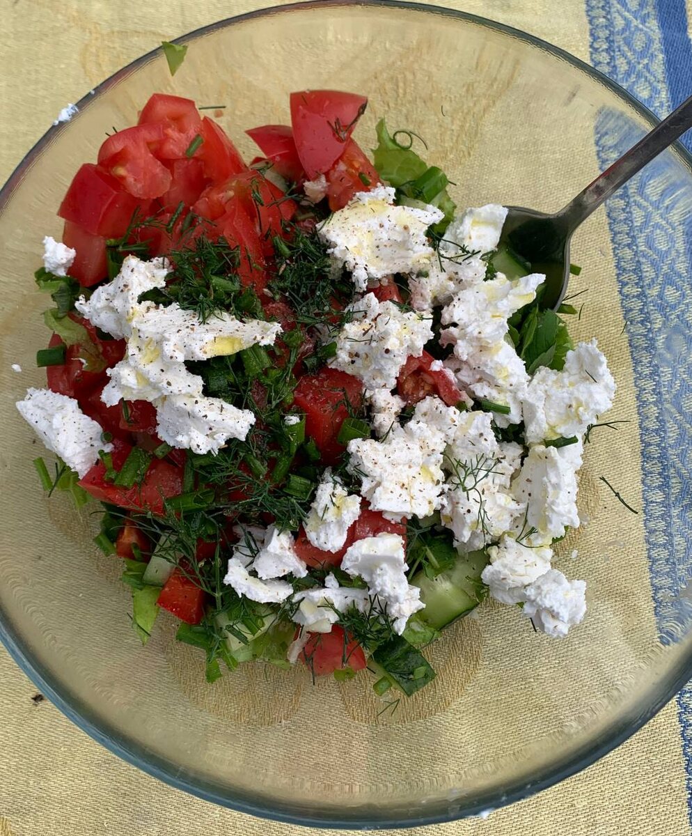 Салат из свежих овощей «1 шт» 😂👌 На две порции: Ароматный спелый помидор 1 шт Болгарский перец 1 шт Огурец свежий 1 шт Пучок листьев салата 1 шт Пучок руколы 1 шт Пучок зеленого лука 1 шт Пучок укропа 1 шт Зубчик чеснока 1 шт Сиртаки сыр Соль Перец Оливковое масло Порезать овощи кубиком, салата листья, руколу произвольно, зелень и чеснок мелко, сыр как придётся, посолить, поперчить, заправить маслом.
